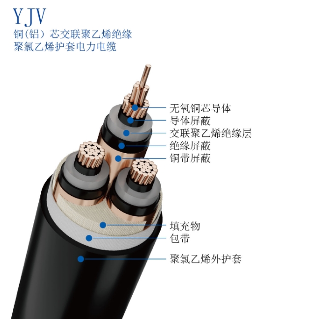 字母含義:YJ:交聯(lián)聚乙烯絕緣;V:聚氯乙烯護套;L:鋁導體(銅導體省略)